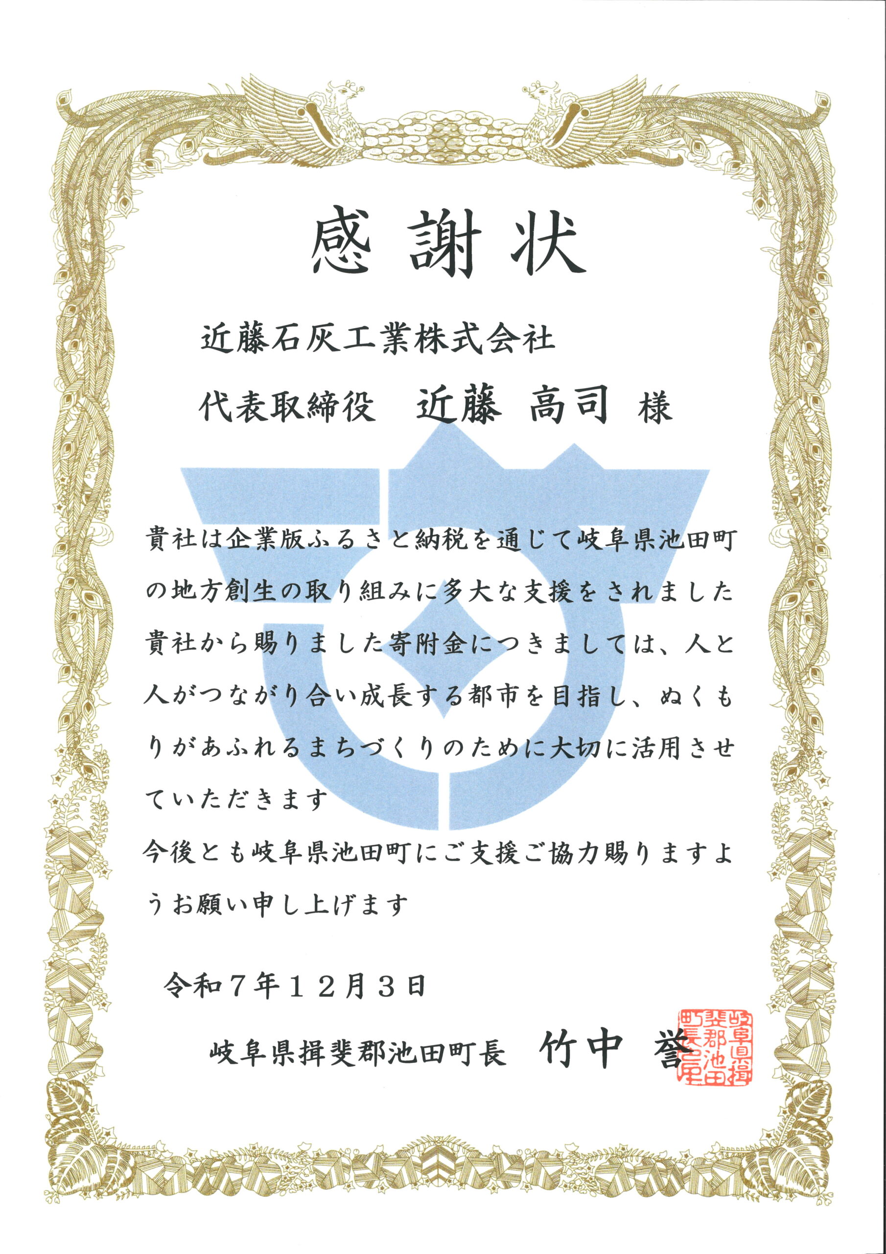 2025年12月に、岐阜県揖斐郡の池田町に対して企業版ふるさと納税を行いました。